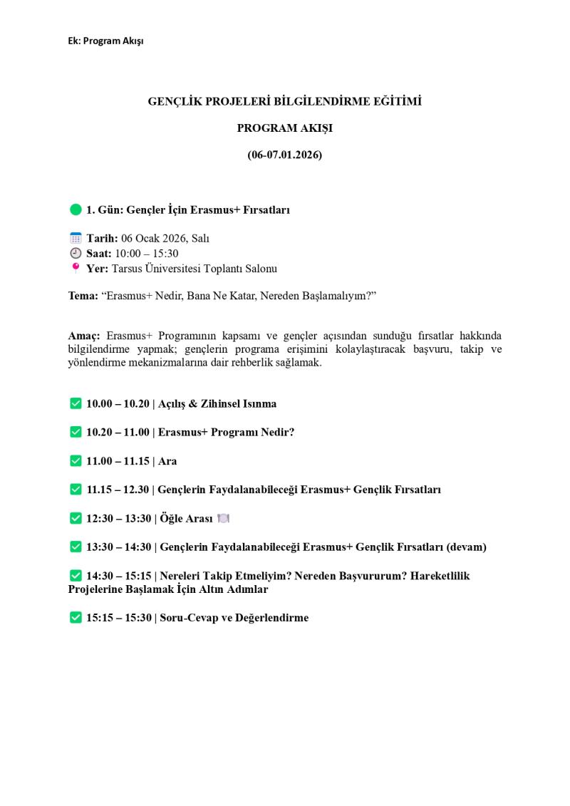 Toplantıda; Erasmus+ Gençlik Projeleri başta olmak üzere, gençlere yönelik proje fırsatları, başvuru koşulları ve başvuru süreçleri ele alınacaktır.